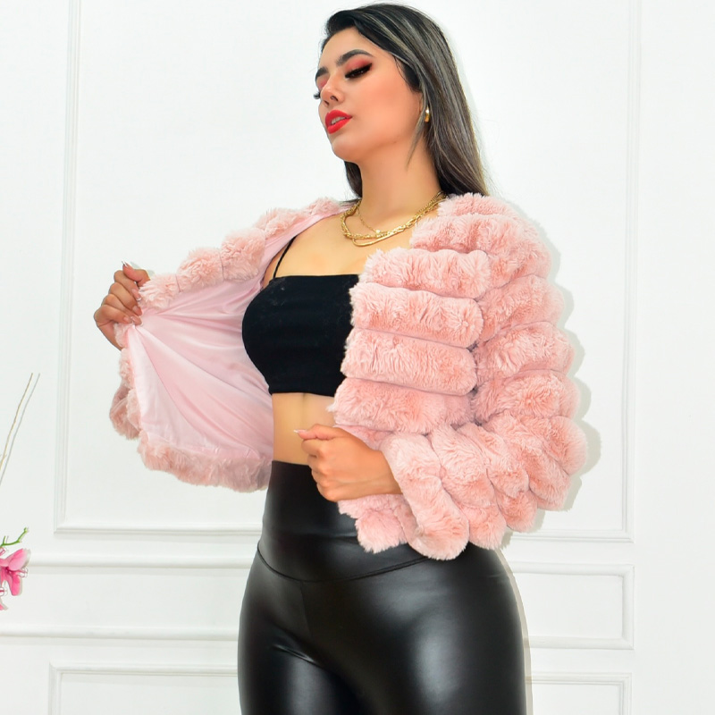 Abrigo corto tipo mink, con efecto bubble o anillado lo que le da una apariencia más acolchada. Forro satinado. Broche frontal para cierre.