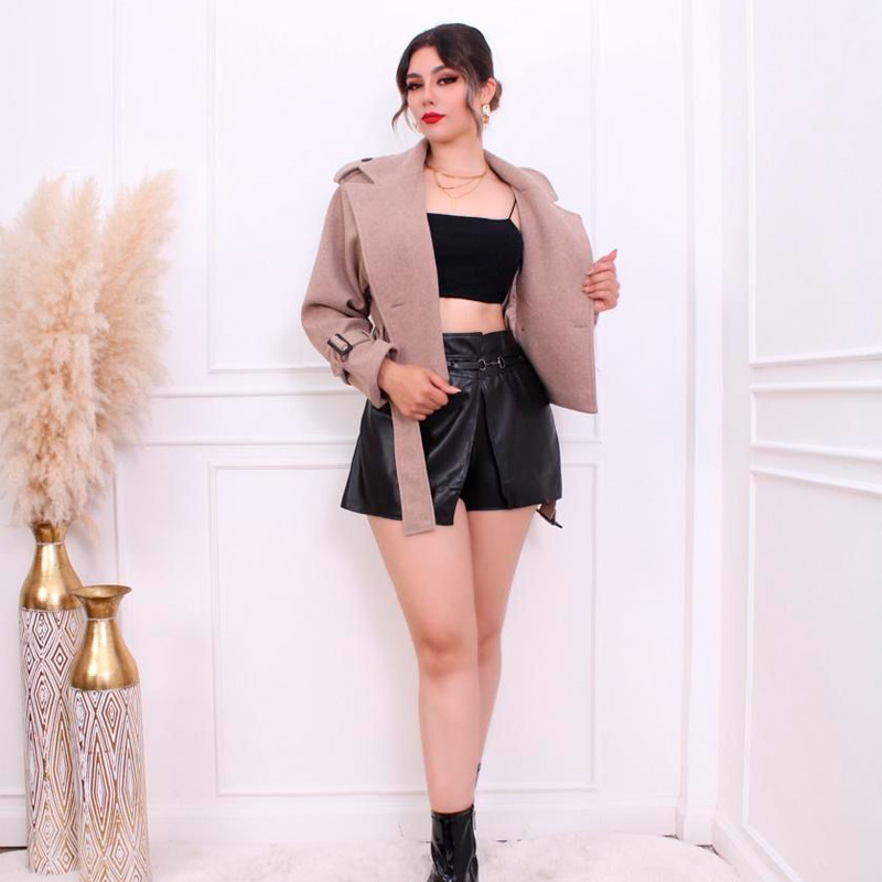 Abrigo corto de paño, diseño oversize de hombros caídos. Cinturón y cintas en muñecas a juego. Diseño de dos botones. Forro satinado.