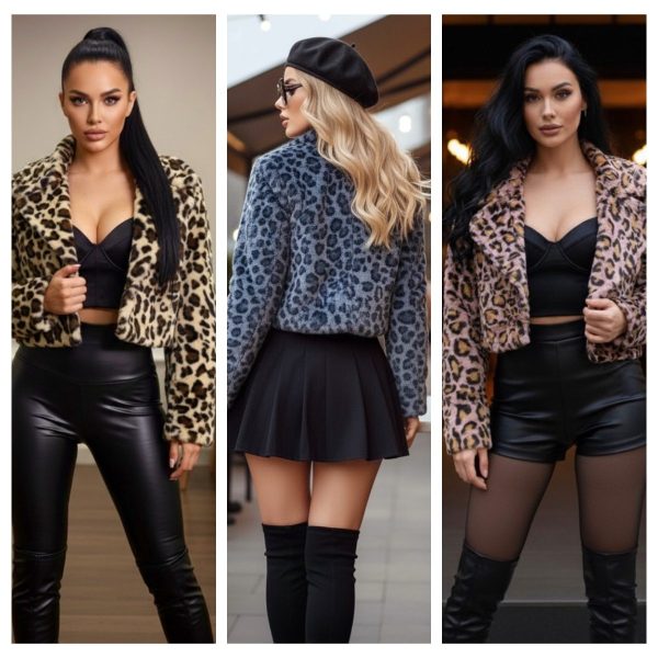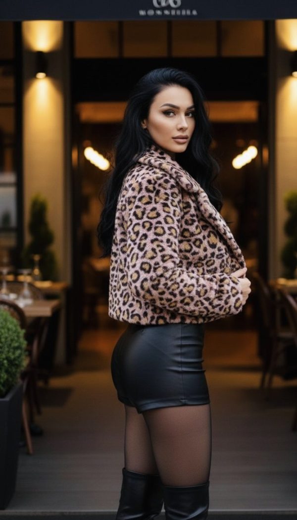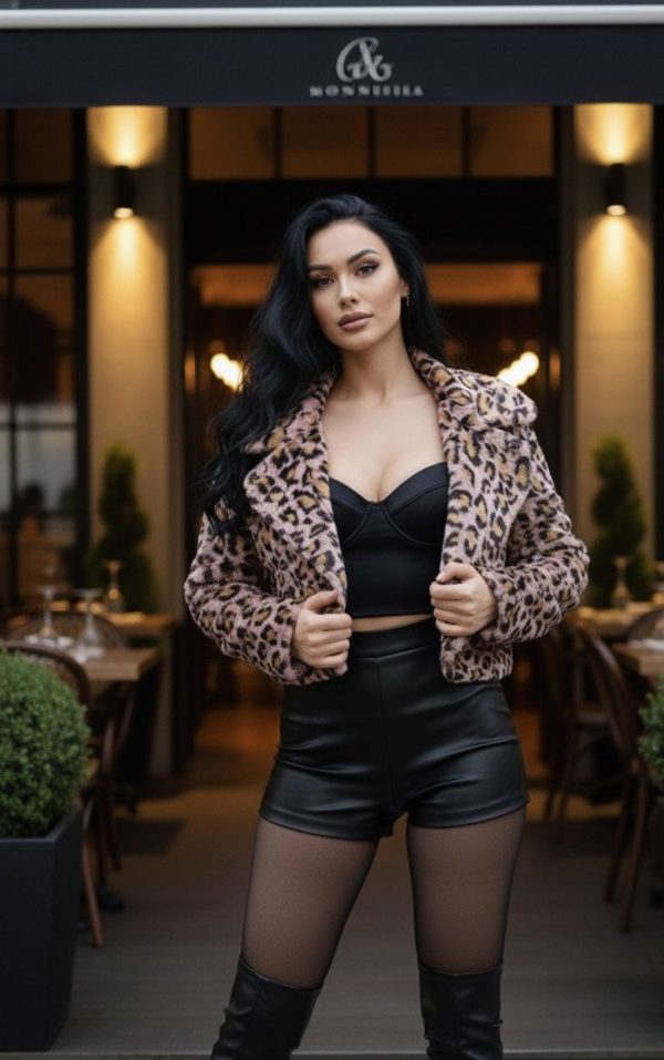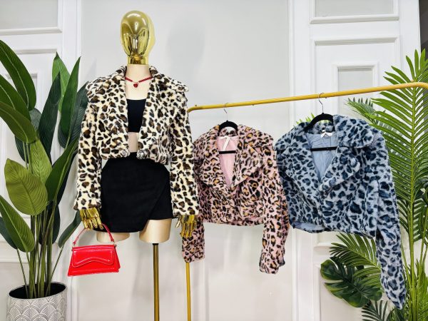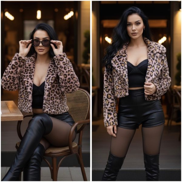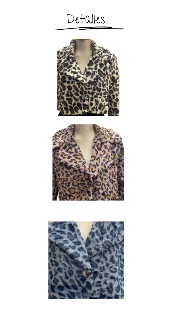 Abrigo corto confeccionado en tela tipo peluche suave, con estampado animal print. Diseño moderno con solapas amplias, botón frontal y corte a la cintura, ideal para realzar la figura.