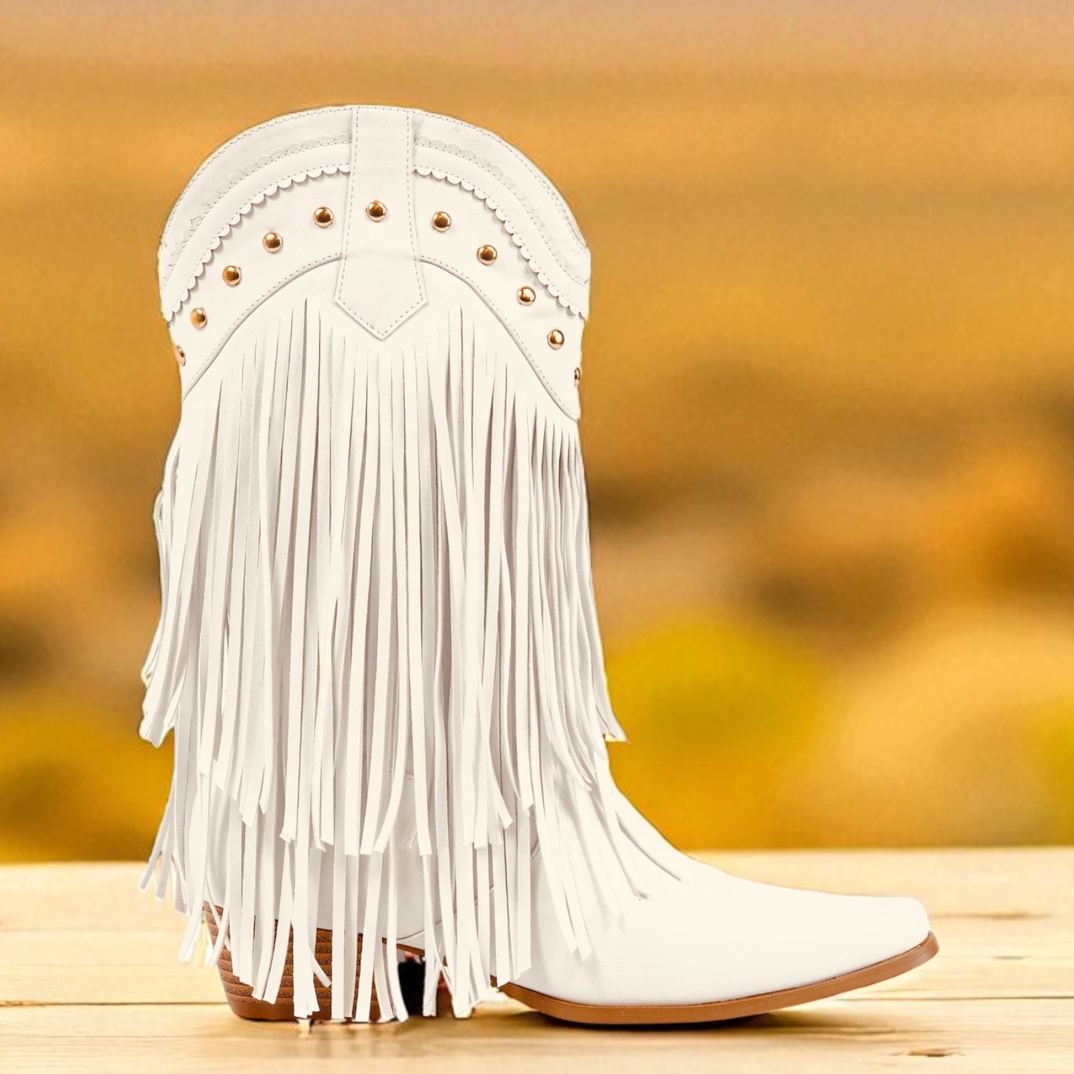 Bota estilo western en color blanco, confeccionado en acabado liso con detalles de flecos largos que aportan movimiento y un toque llamativo. Presenta aplicaciones de tachuelas doradas en la parte superior y bordes decorativos con diseño festoneado. Punta ligeramente afilada, tacón bajo cuadrado en tono madera. Ideal para darle un aire trendy a tus outfits. 🤠