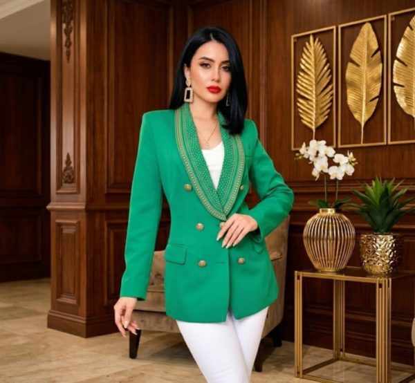 MAXI BLAZER CON ESTOPEROL INCRUSTADO EN TONO DORADO EN TODA LA SOLAPA. BOTONES DECORATIVOS EN TONO DORADO