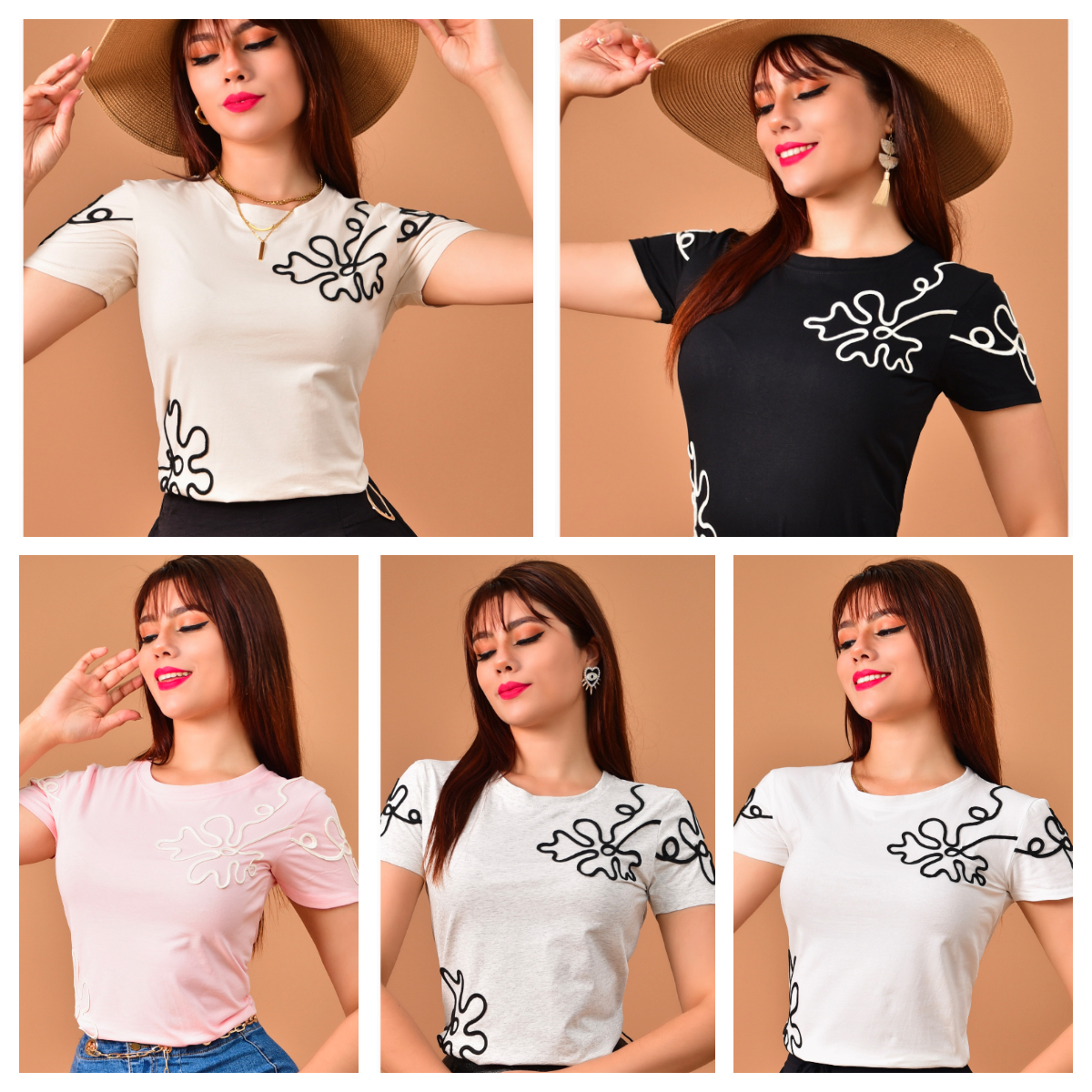 Blusa de manga corta confeccionada en tela suave y fresca de excelente calidad. Diseño con aplicaciones bordadas en relieve con diseño abstracto que le dan un toque artístico y moderno. Corte recto, cuello redondo para un ajuste cómodo y versátil.