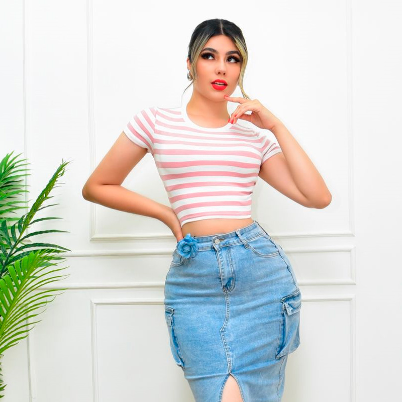 Blusa corta de cuello redondo a rayas. Manga corta. Super stretch.