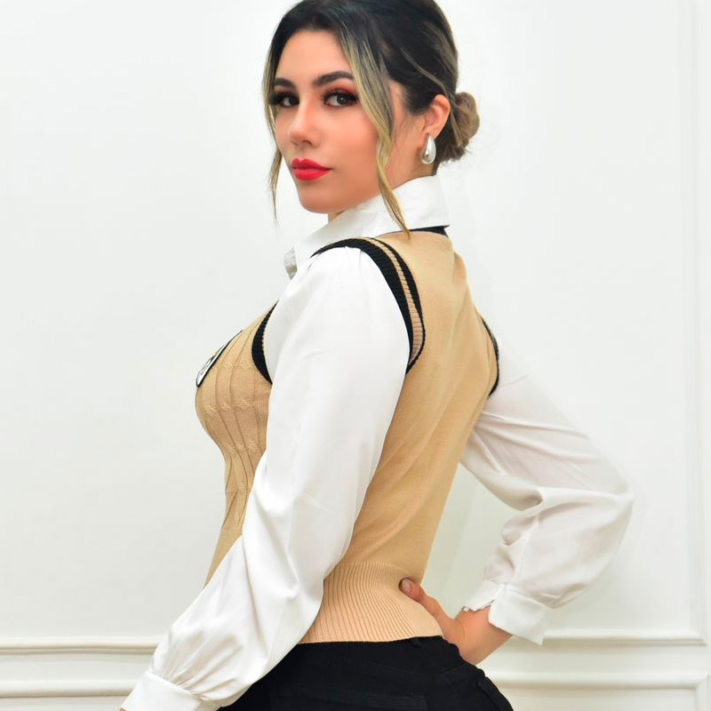 Versátil blusa con dos texturas, torso de punto diseño de chaleco, mangas y cuello de camisa lo que da apariencia de dos prendas. abarca de 5 a 11