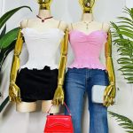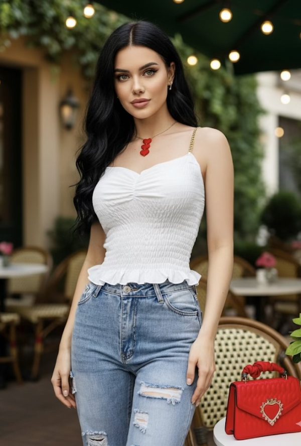 Blusa con elástico corrugado. Fruncido en busto. Tirantes de cadenas doradas. Súper fresca y femenina.