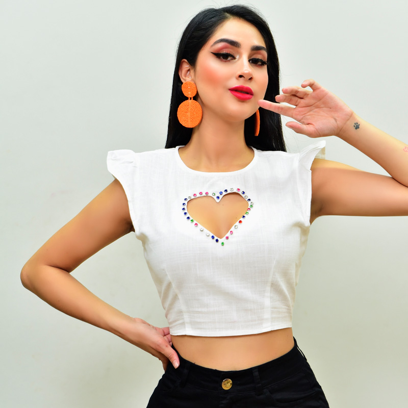Blusa de algodón con diseño de corazón con pedrería de colores en escote. Mangas tipo mariposa. Cuello redondo y botón en nuca.