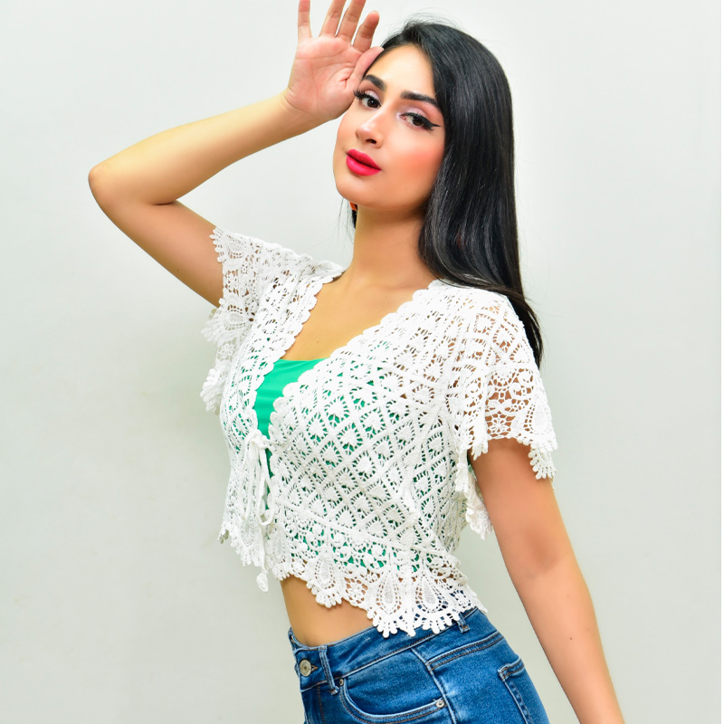 Blusa cruzada de crochet. Mangas tipo mariposa, escote en V. Cintas para ajustar al frente.