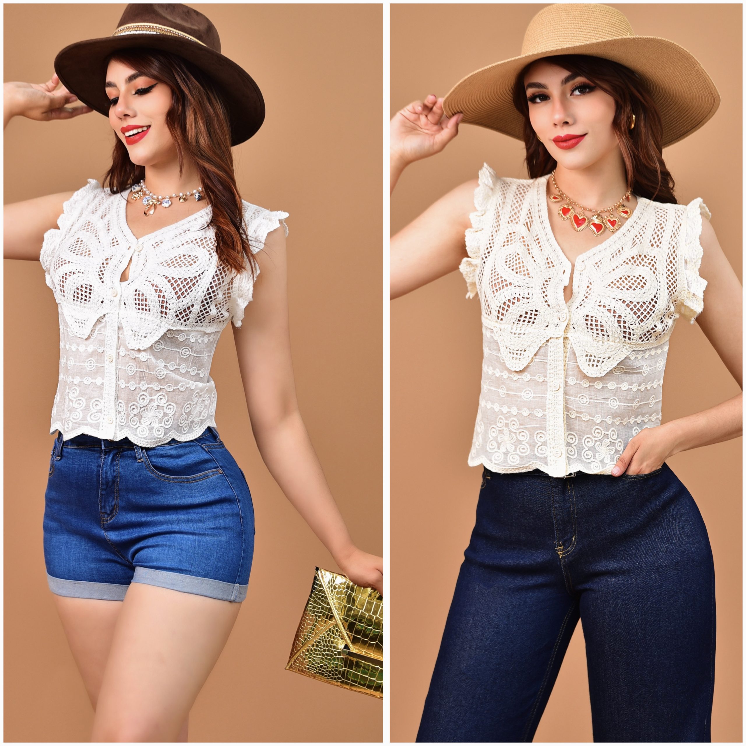 Preciosa blusa sin mangas de encaje con detalles artesanales de patrones florales. Detalle de mariposa elaborado en crochet. Pequeños volantes de encaje en las mangas. Botones frontales. Súper fresca y liviana. No estira.