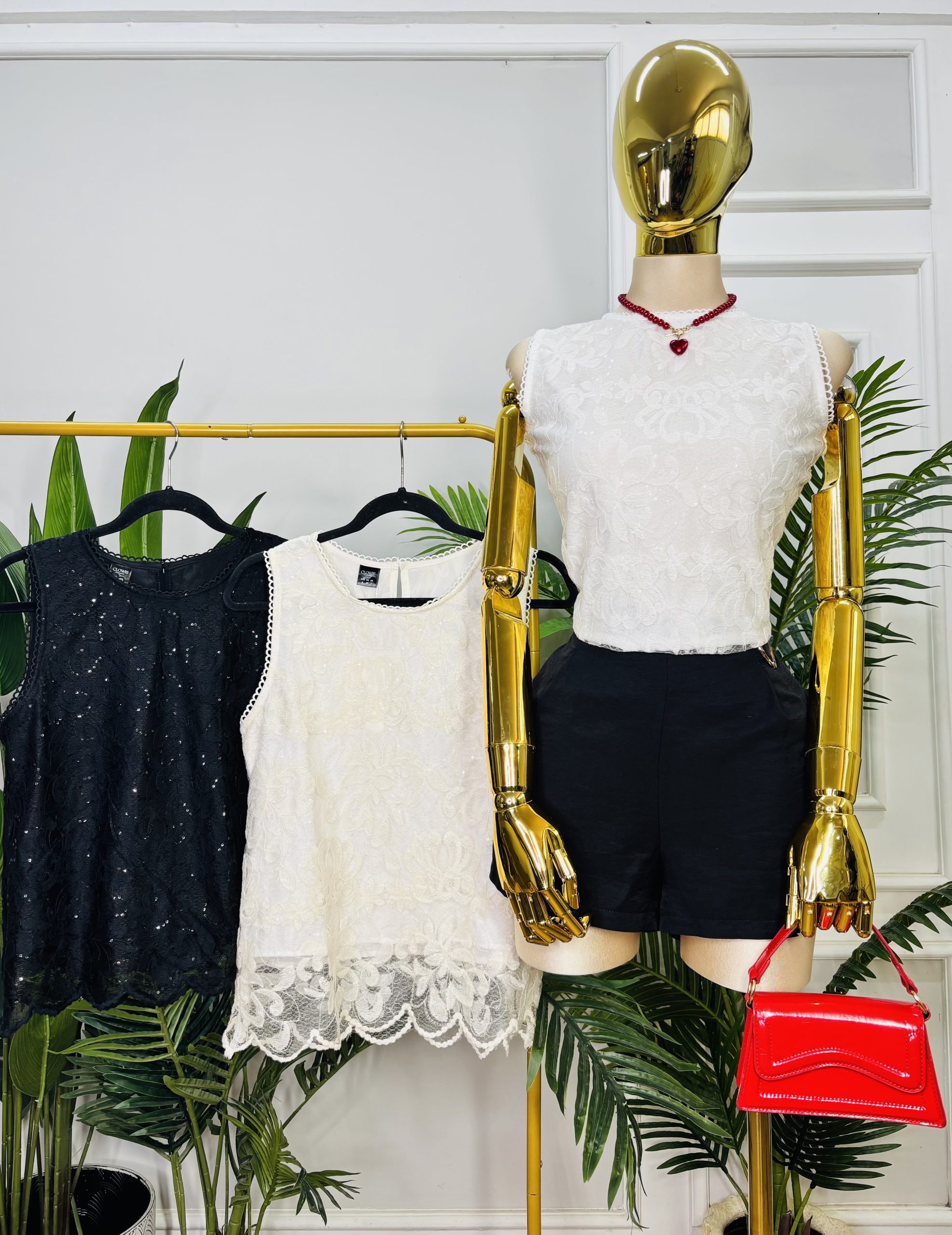 Hermosa blusa sin mangas, confeccionada con un delicado tejido de encaje. Cuello redondo y un ribete festoneado a lo largo del cuello y las sisas, añadiendo un toque elegante. Ajuste ligeramente entallado con dobladillo de varios niveles con volantes de encaje festoneado, lo que le da un aspecto romántico y femenino. No estira.