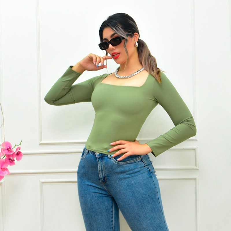 Blusa de viscosa de manga larga, escote cuadrado, super stretch. Suave al tacto.