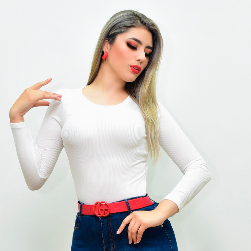 Blusa básica de punto delgado. Cuello circular y manga larga. Tela strech.