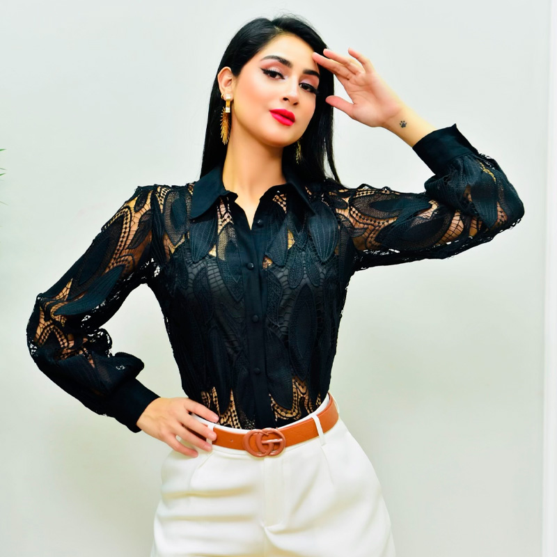 Blusa camisa de encaje, manga larga, forro incluido en mismo tono, botones forrados.