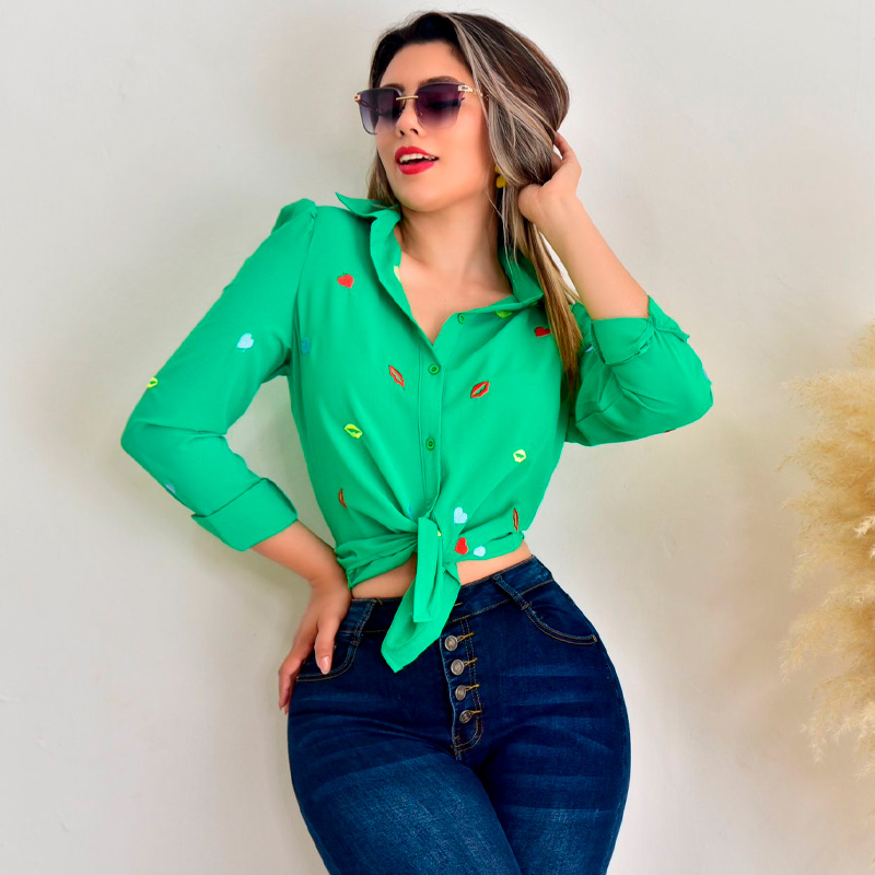 Camisa fit manga larga. Adorables bordados de corazones y besos multicolor.