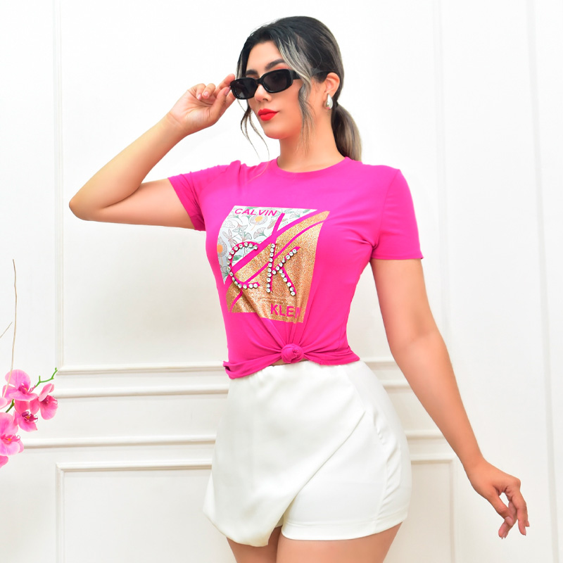 Blusa de algodón con estampado e incrustaciones inspiración CK, stretch.