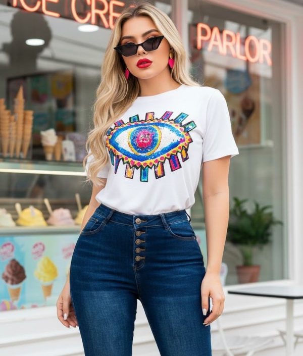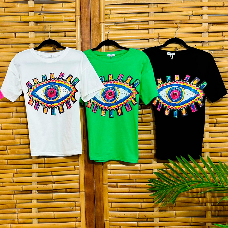 Blusa de algodón estampada. Diseño de ojo con múltiples colores y figuras. Incrustación de pedrería que le da un toque súper glam.