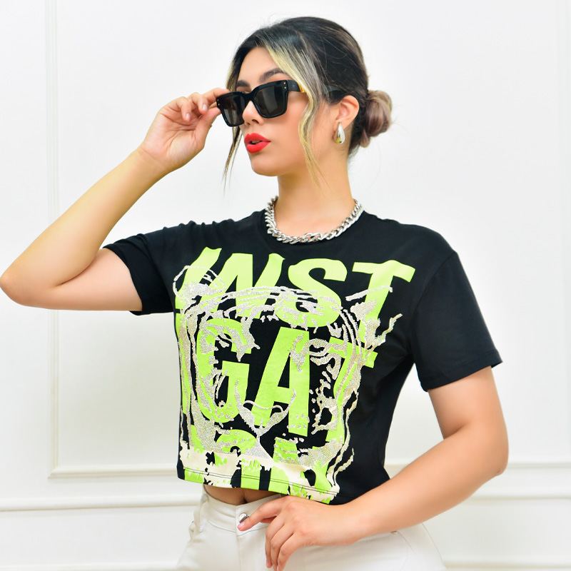 Blusa de algodón vulcanizada en colores fluorescentes, incrustaciones de brillos para dar textura. Stretch.