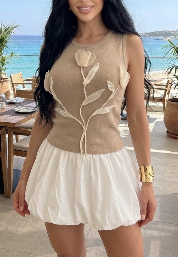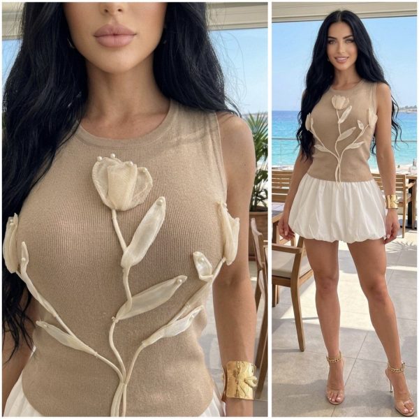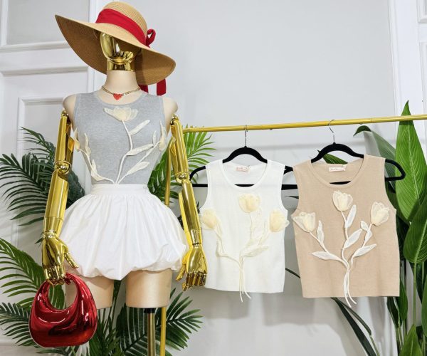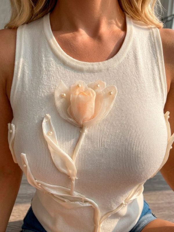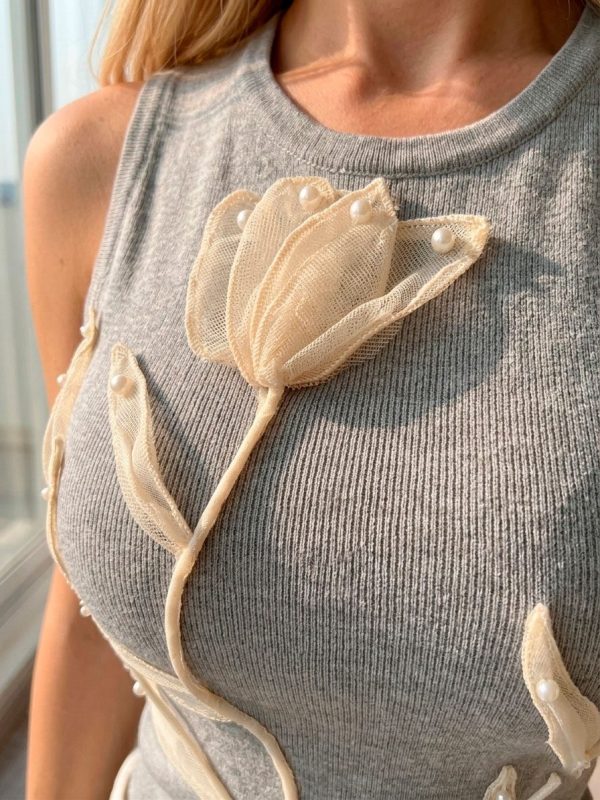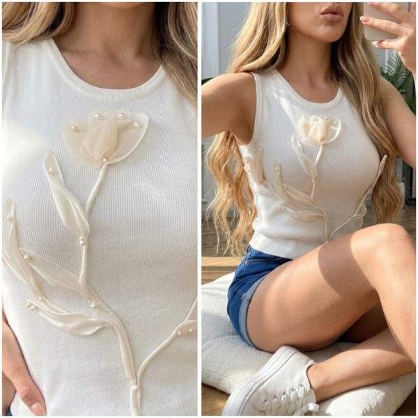 Blusa sin mangas de viscosa con un diseño delicado y femenino. Destaca por sus aplicaciones en 3D en forma de flores tipo tulipán, elaboradas en tela translúcida con detalles de pequeñas perlas que aportan un toque sofisticado y romántico. Corte recto y cuello redondo. Tela stretch.
