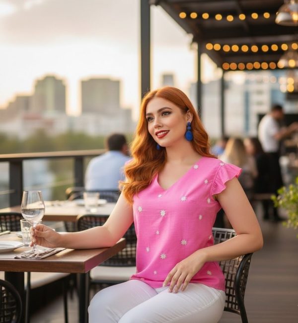 Blusa de viscosa con diseño de florecitas bordadas. Escote en V, mangas tipo mariposa. Super fresca y comoda.