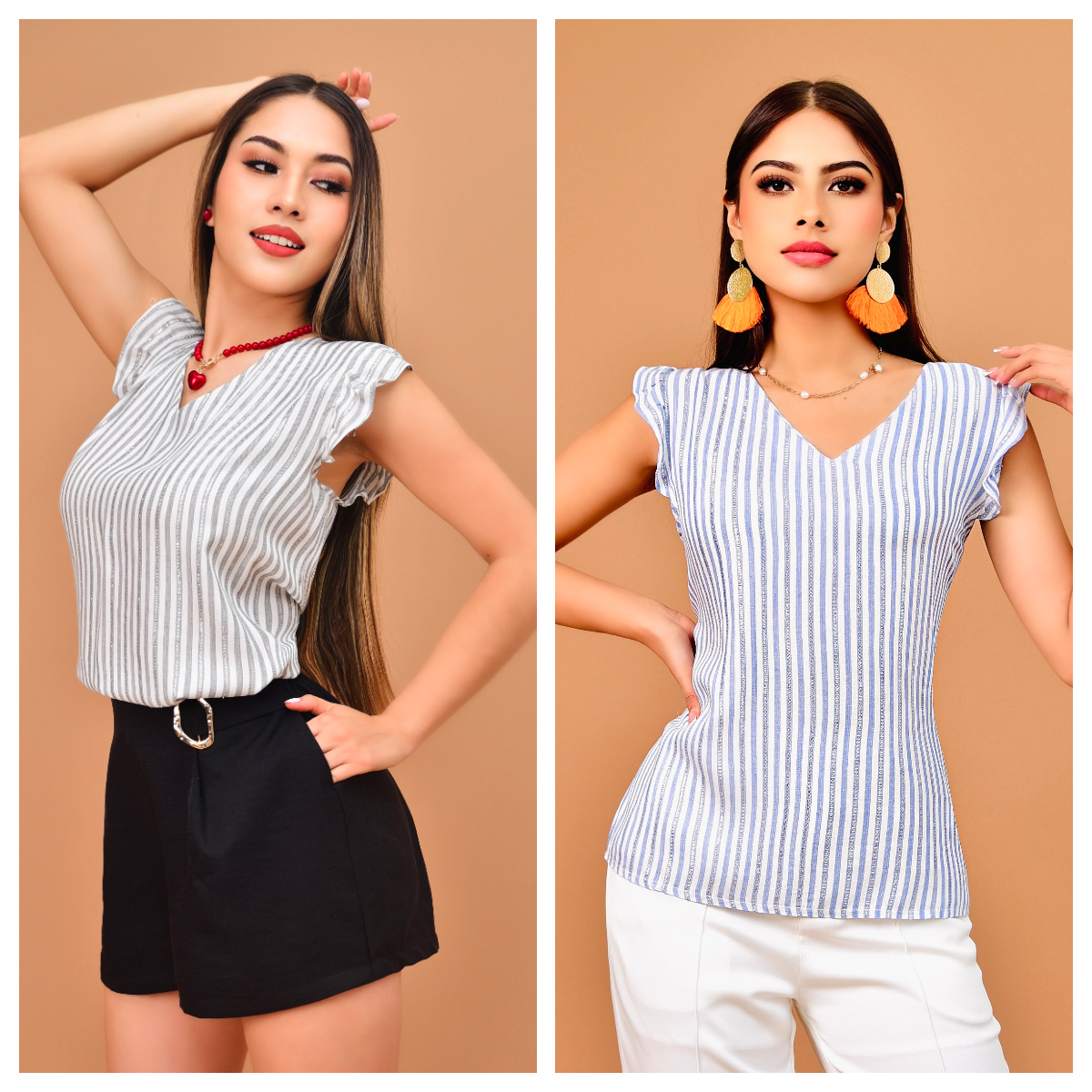 Preciosa blusa fresca casual de manga corta con detalle de olán. Escote en “V”. Diseño a rayas verticales con un toque de hilo plateado. Corte recto y ligeramente holgado.