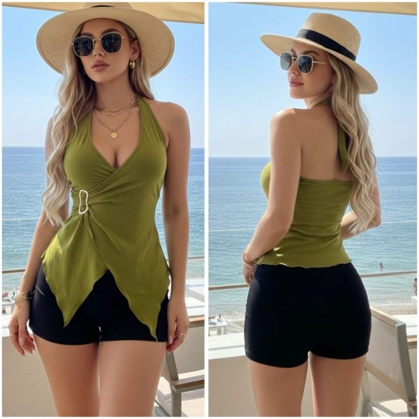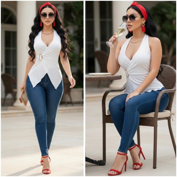 Blusa con diseño halter que estiliza los hombros y realza la silueta. Confeccionada en tela de viscosa, suave y ligera, escote en V cruzado tipo wrap que aporta un efecto favorecedor al busto. Detalle lateral con hebilla decorativa que ajusta delicadamente la prenda a la cintura, creando un efecto más definido y femenino. Terminado en pico y espalda descubierta.