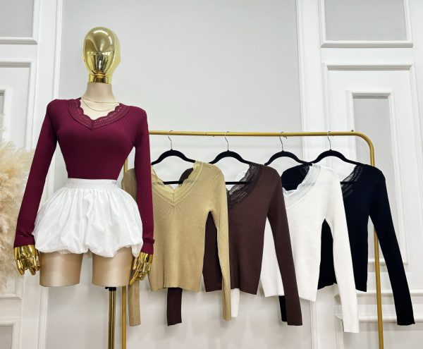 Blusa confeccionada en viscosa stretch acanalada con escote en V adornado con delicado encaje, que le da un toque súper femenino y elegante. 😍