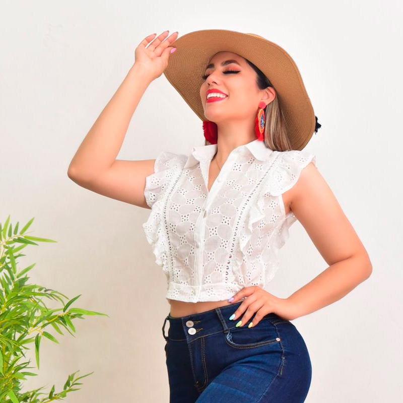 Espectacular blusa con botones forrados. Mangas tipo mariposa. Preciosos detalles de tira bordada.