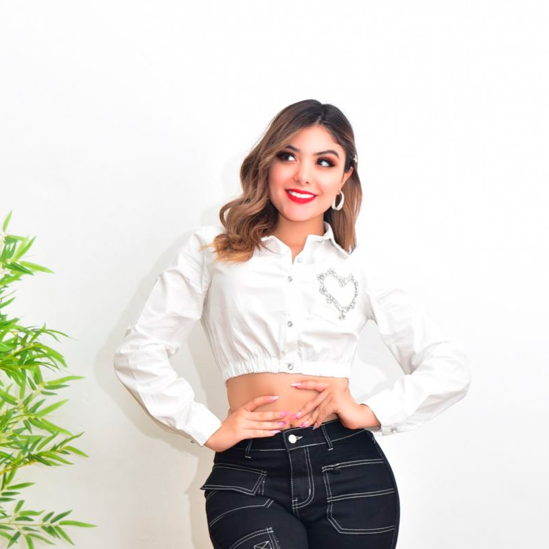 Camisa con elástico en cintura que estiliza figura. Corazón de pedrería en bolsillo, botones de pedrería.