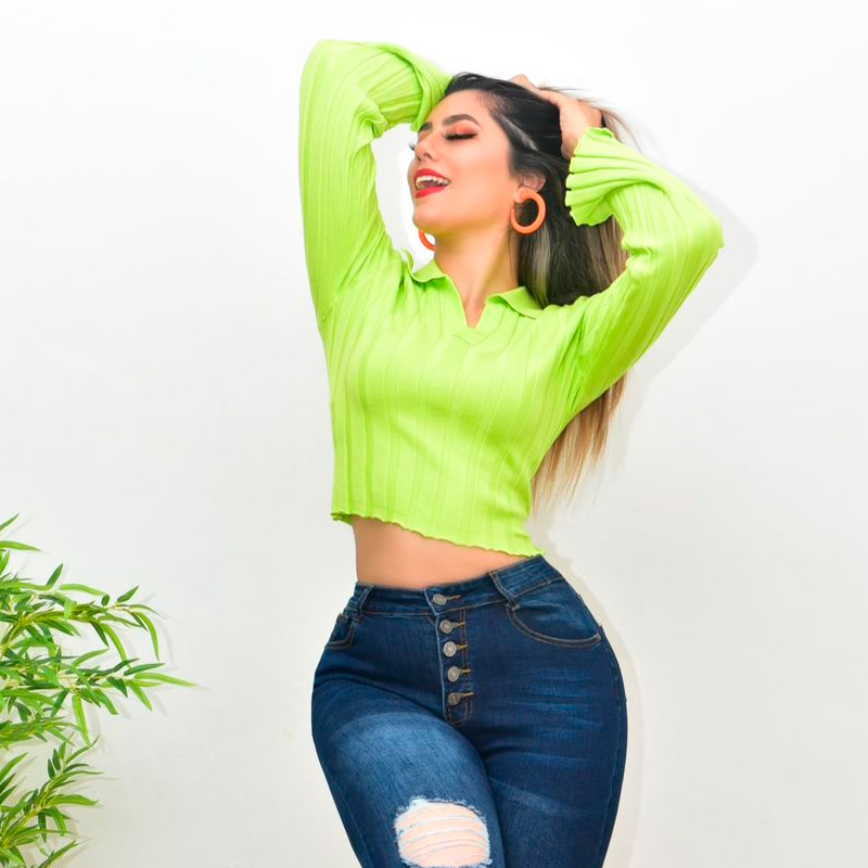 Suave blusa de manga larga. Cuello tipo polo. Relieves en franjas.
