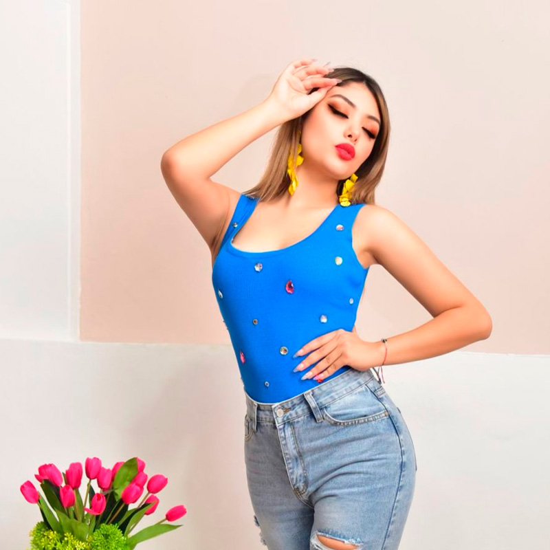 Blusa básica corte tank. Incrustación de gemas y piedras de fantasía. Stretch