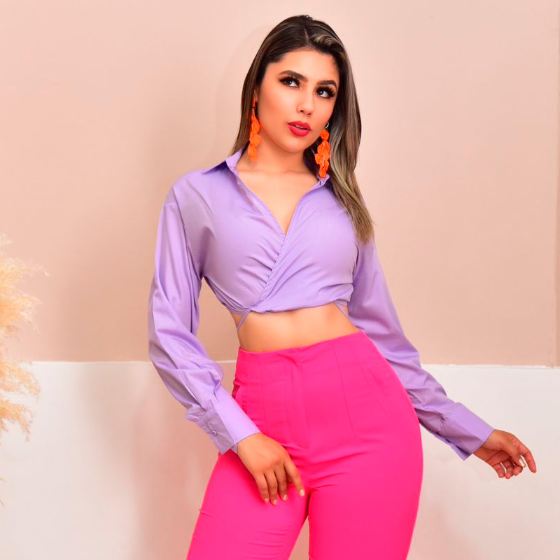 Blusa cropped cruzada con ajuste de cordones en espalda. Cuello camisero, escote en V. Elástico en espalda.