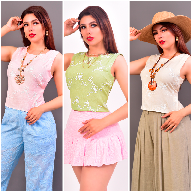 Blusa básica de viscosa, con bordados florales en cadeneta. Cuello redondo, botón en nuca.