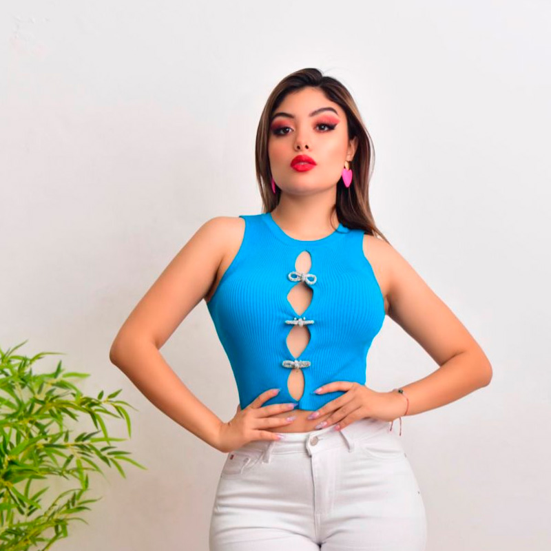 Llamativa blusa de punto con aberturas tipo gota en el pecho. Acanalada. Tela stretch. Broches con pedrería en forma de moño desmontables