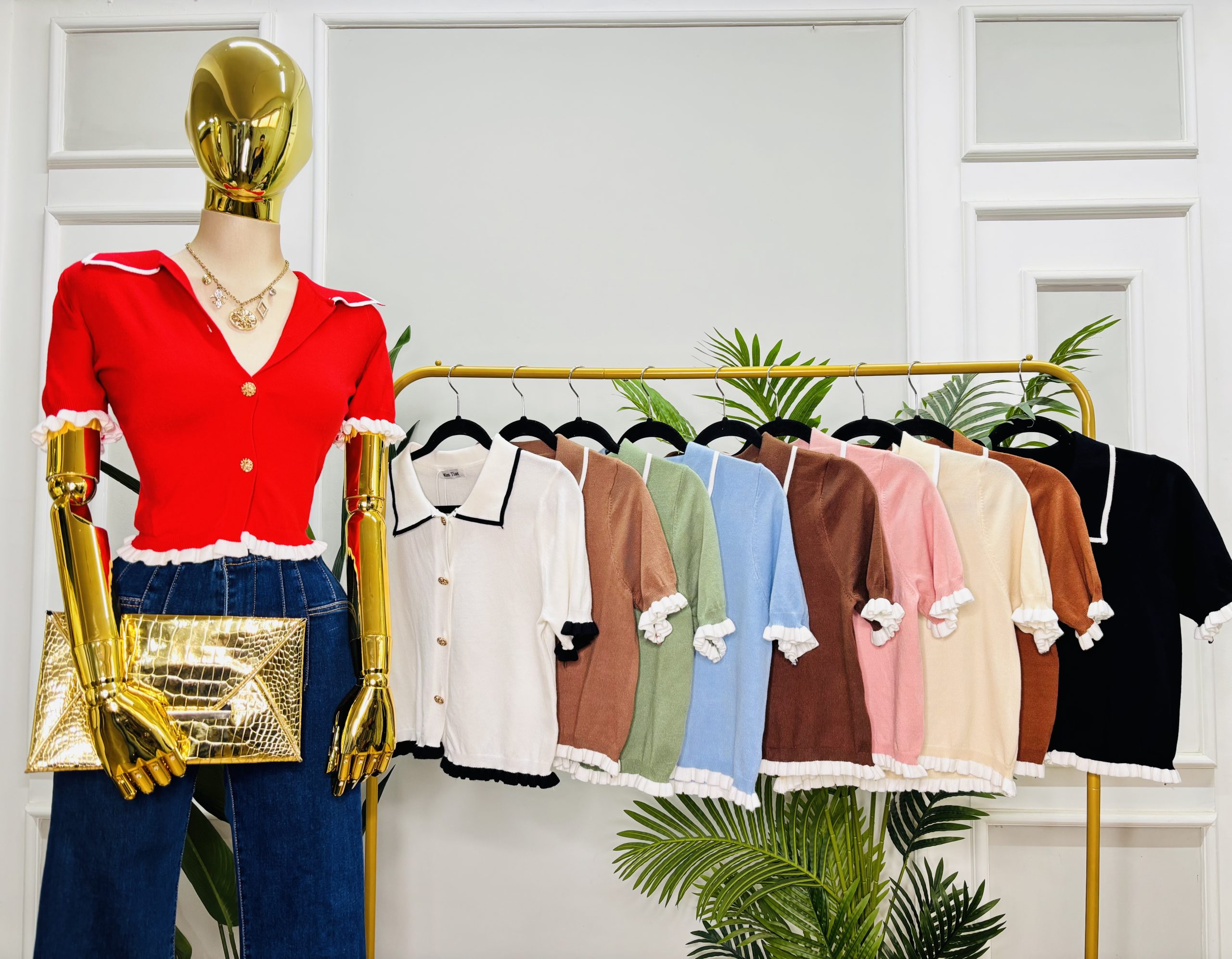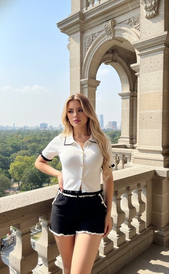 Delicada blusa de punto confeccionada en algodón. Cuello tipo camisero con ribete blanco. Mangas cortas con sutil olan blanco en el puño. Botonadura dorada. Sutil ajuste en la cintura y acabado con olan en el borde inferior para un efecto entallado y coqueto. perfecta para lucir encantadora con un look femenino y sofisticado.