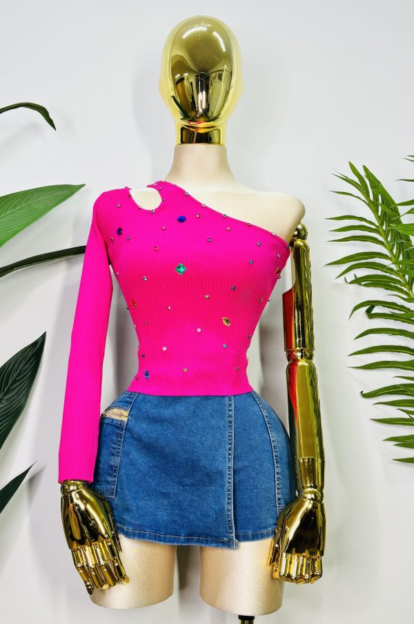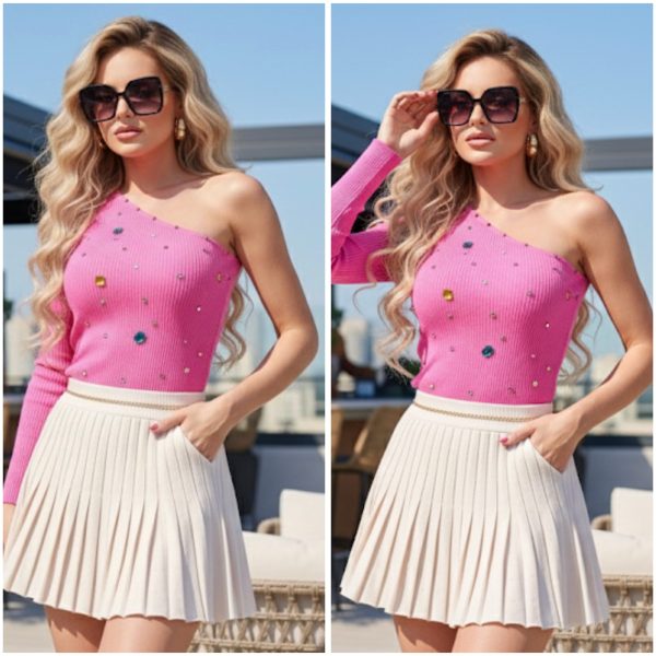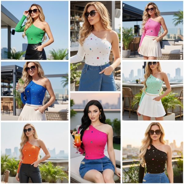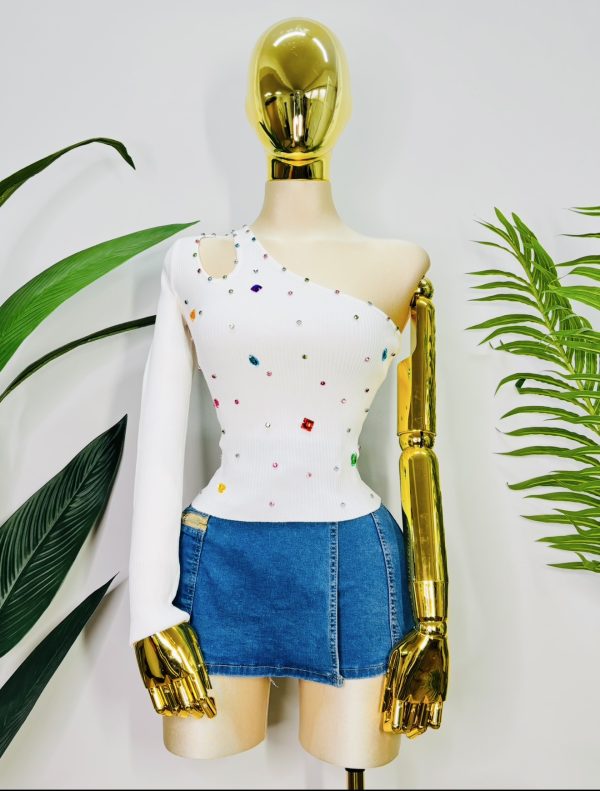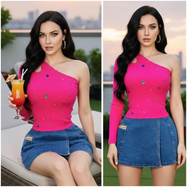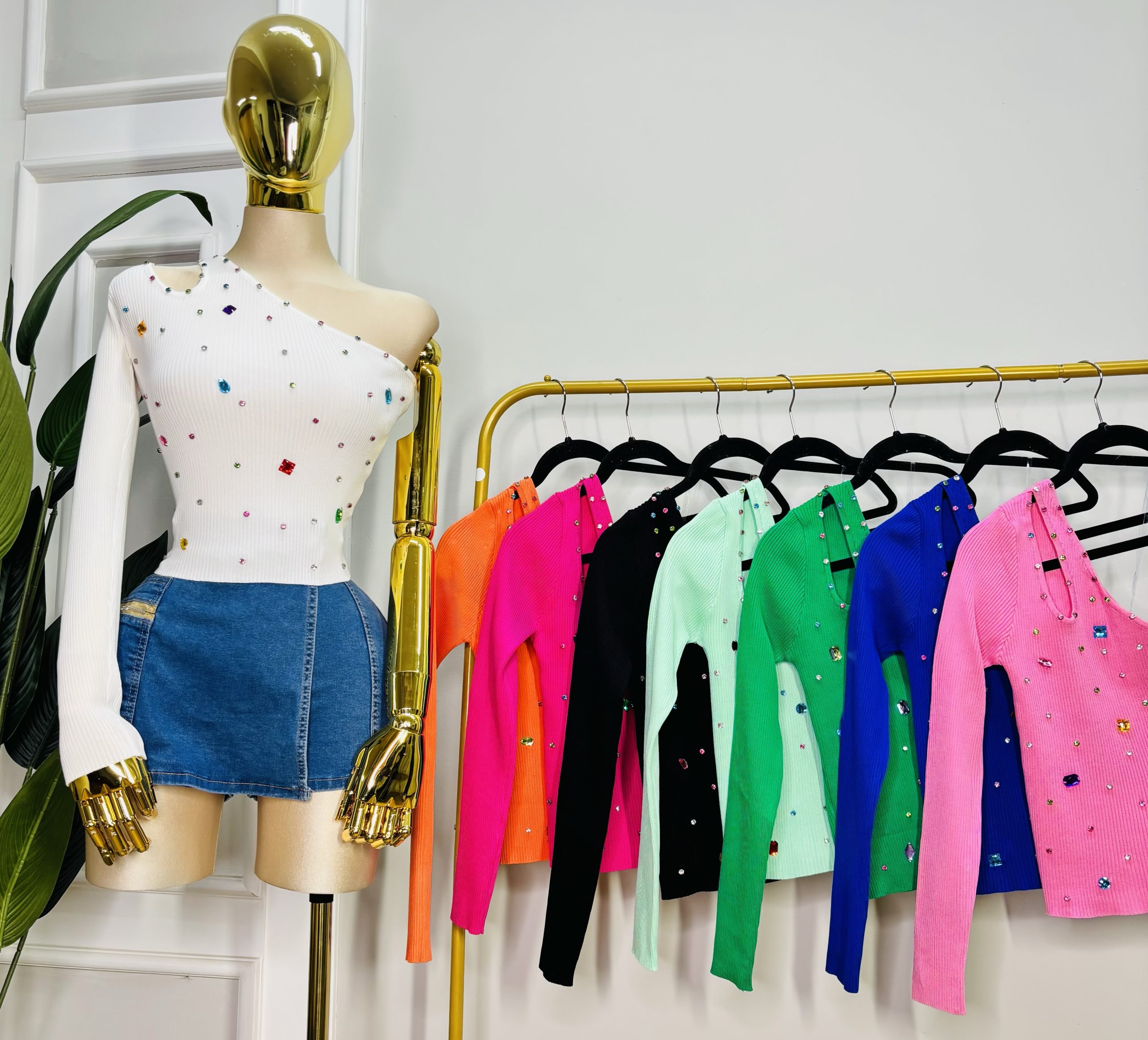 🥰 BLUSA TEJIDO DE PUNTO ONE SHOULDER Blusa de punto acanalada. Incrustación de pedrería de colores. Manga larga. Cutout en hombro. Súper stretch. 📌 Corte amplio IMPORTACIÓN CALIDAD 💎💎💎💎💎💎💎💎