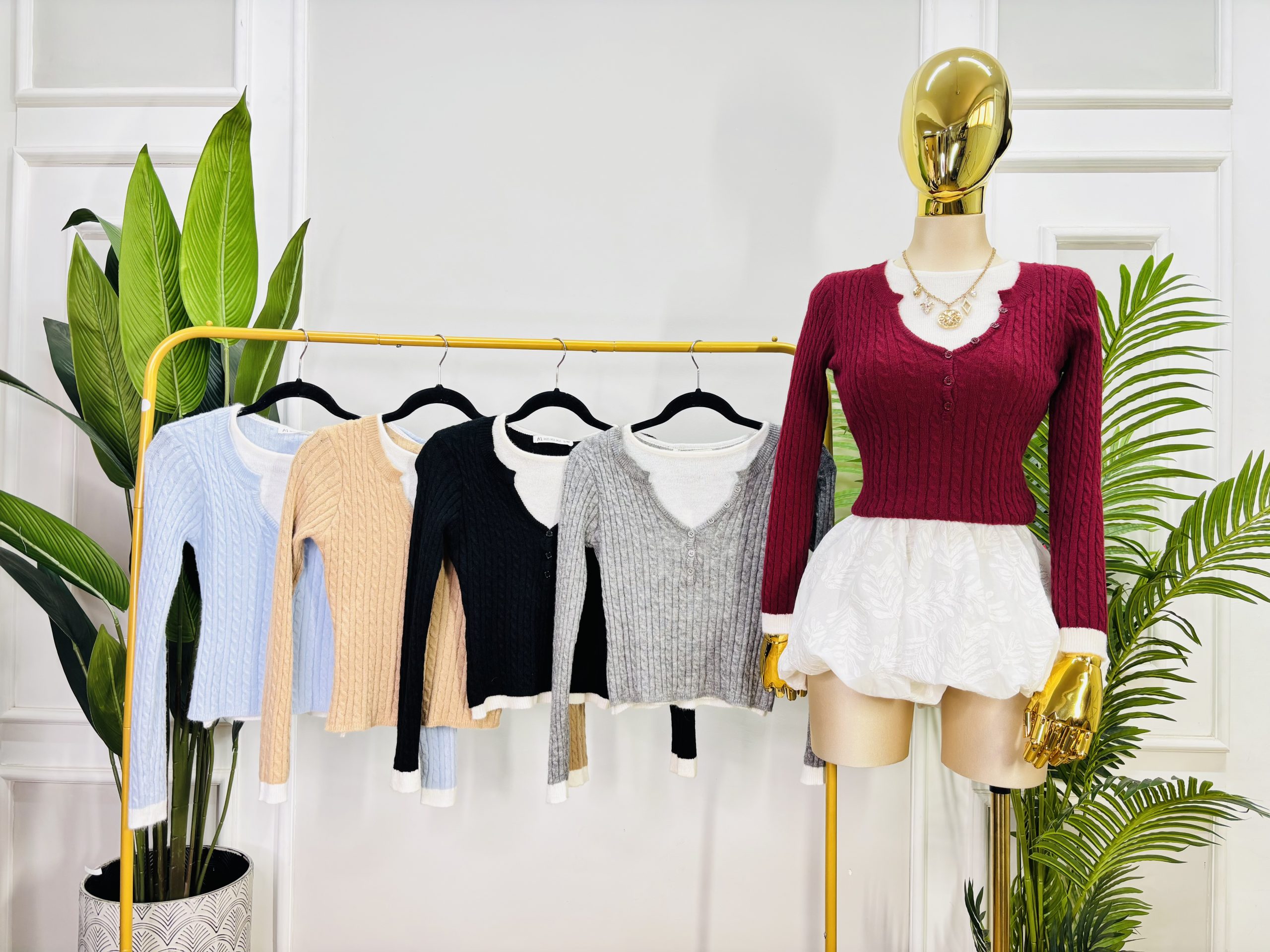 Blusa tipo suéter tejido en punto trenzado. Ideal para un look casual y acogedor. Diseño con escote en ‘V’ y botones frontales decorativos. Manga larga ajustada para mayor calidez. Incluye detalle de interior en color blanco que crea un efecto doble vista, añadiendo contraste y estilo.
