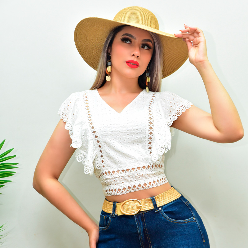 Blusa 100% algodón de tira bordada. Cuello en V, volantes en manga tipo mariposa.Elástico en cintura. Forro en parte frontal.