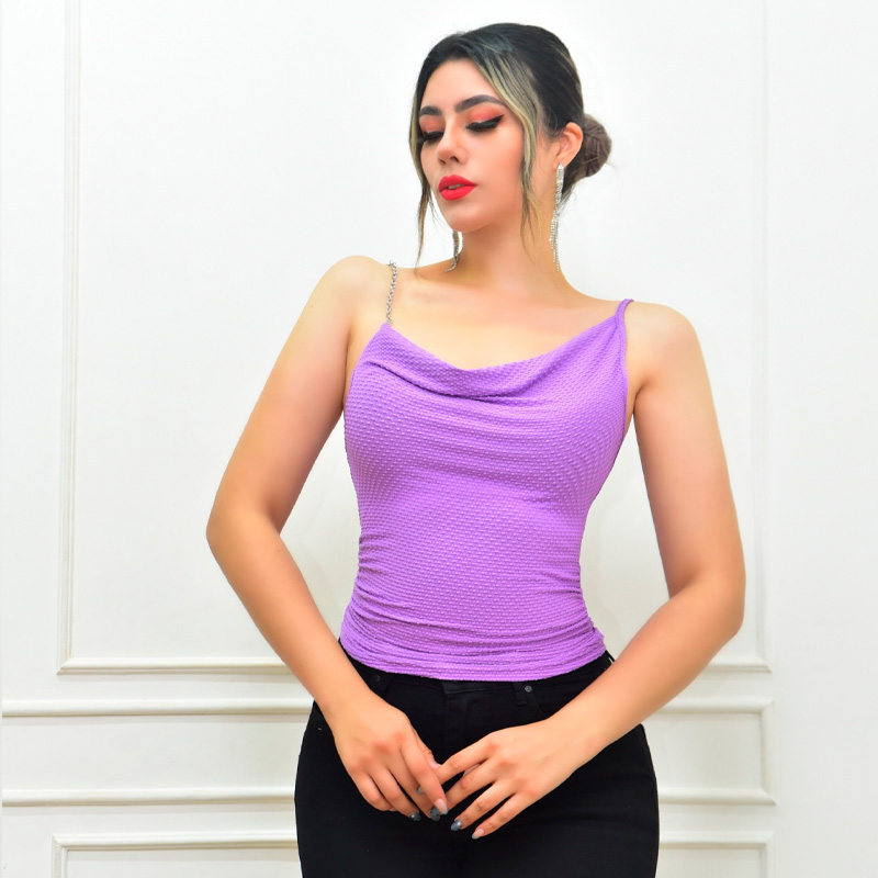 Blusa texturizada en puntos. Diseño asimétrico, tirante de cadenas. Drapeado en cintura.