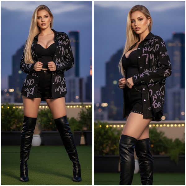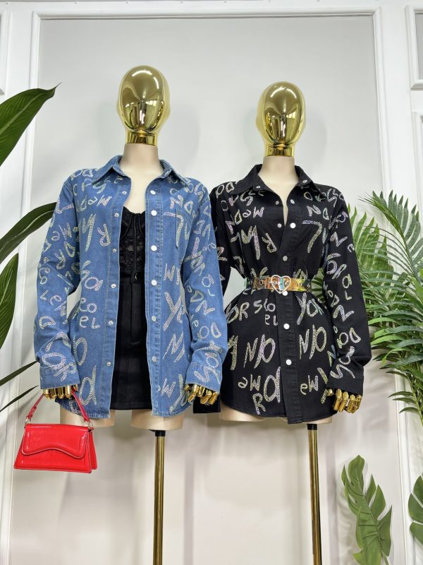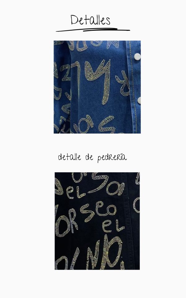 Blusón de mezclilla ligera con diseño de gráficos tipo lettering de pedrería tornasol que le dan un brillo súper moderno y llamativo. Cuenta con botones de broche, prácticos y fáciles de abrir/cerrar. Ideal para usarlo como sobreprenda o cerrado según tu estilo.
