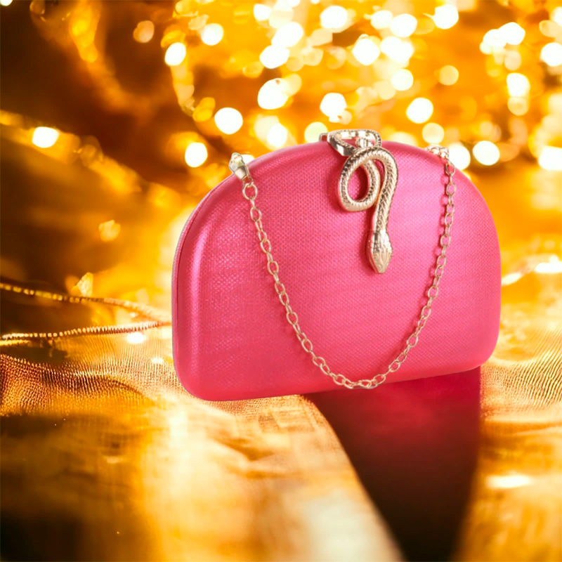 Bolsa de Fiesta para Dama con detalle de serpiente en el broche, hecha de Piel Sintética, Asa metálica de cadena, contiene broche metálico. Disponible en diferentes colores.