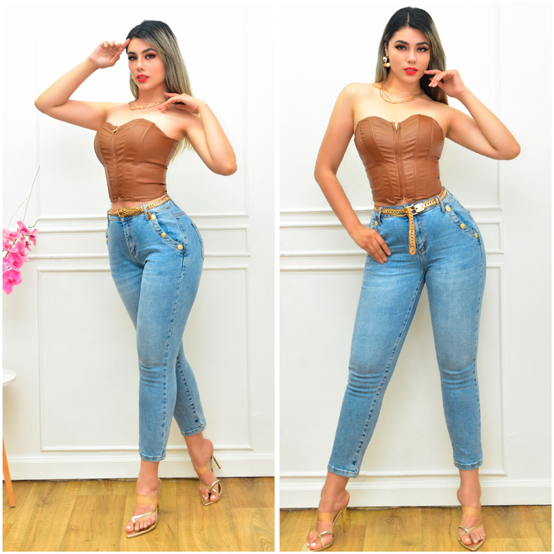 Jeans básico azul claro, super stretch. Push Up en glúteos. Dobladillo en tobillo. Incluye cinturón con hebilla en forma de corazón.