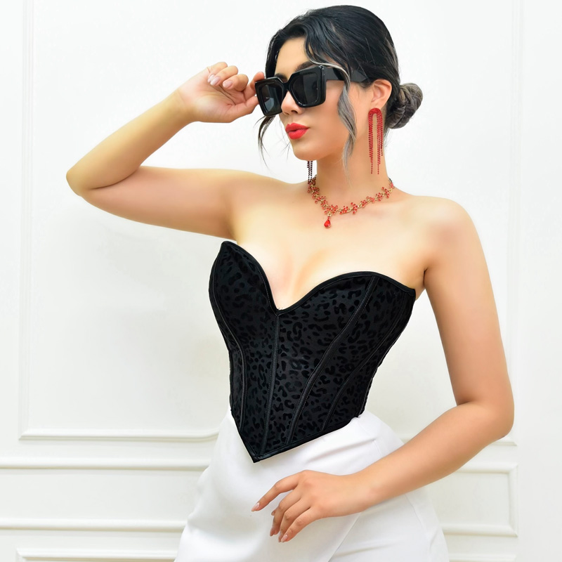 Bustier con varillas corte en V, escote corazón. Estampado animalprint. Ajuste cruzado posterior con listones tipo corset, ojales metálicos. Panel de modestia en espalda.