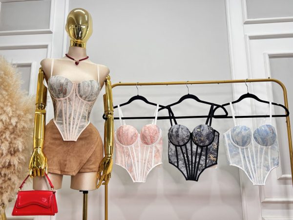 Bustier tipo corset con varillas que estilizan la figura. Está confeccionado en mesh translúcido con un delicado estampado en tonos pastel creando un efecto etéreo y artístico. 💖