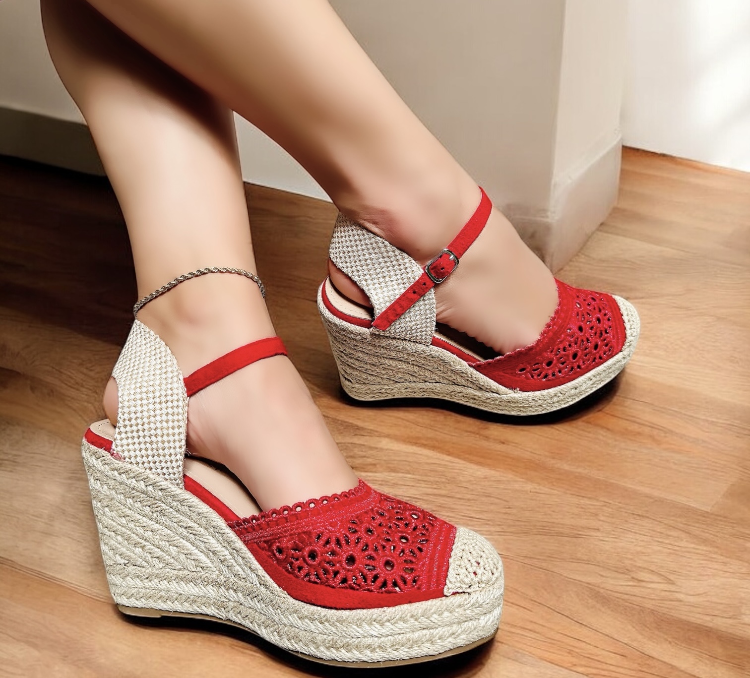 Sandalia espadrille roja con bordado floral y plataforma de yute. Elegante sandalia tipo cuña. Diseño superior con bordado rojo floral calado, que le añade un toque artesanal y femenino. La parte trasera cuenta con soporte de tejido. Correa ajustable al tobillo con hebilla para mayor seguridad al caminar. Ideal para looks casuales o bohemios en primavera y verano.