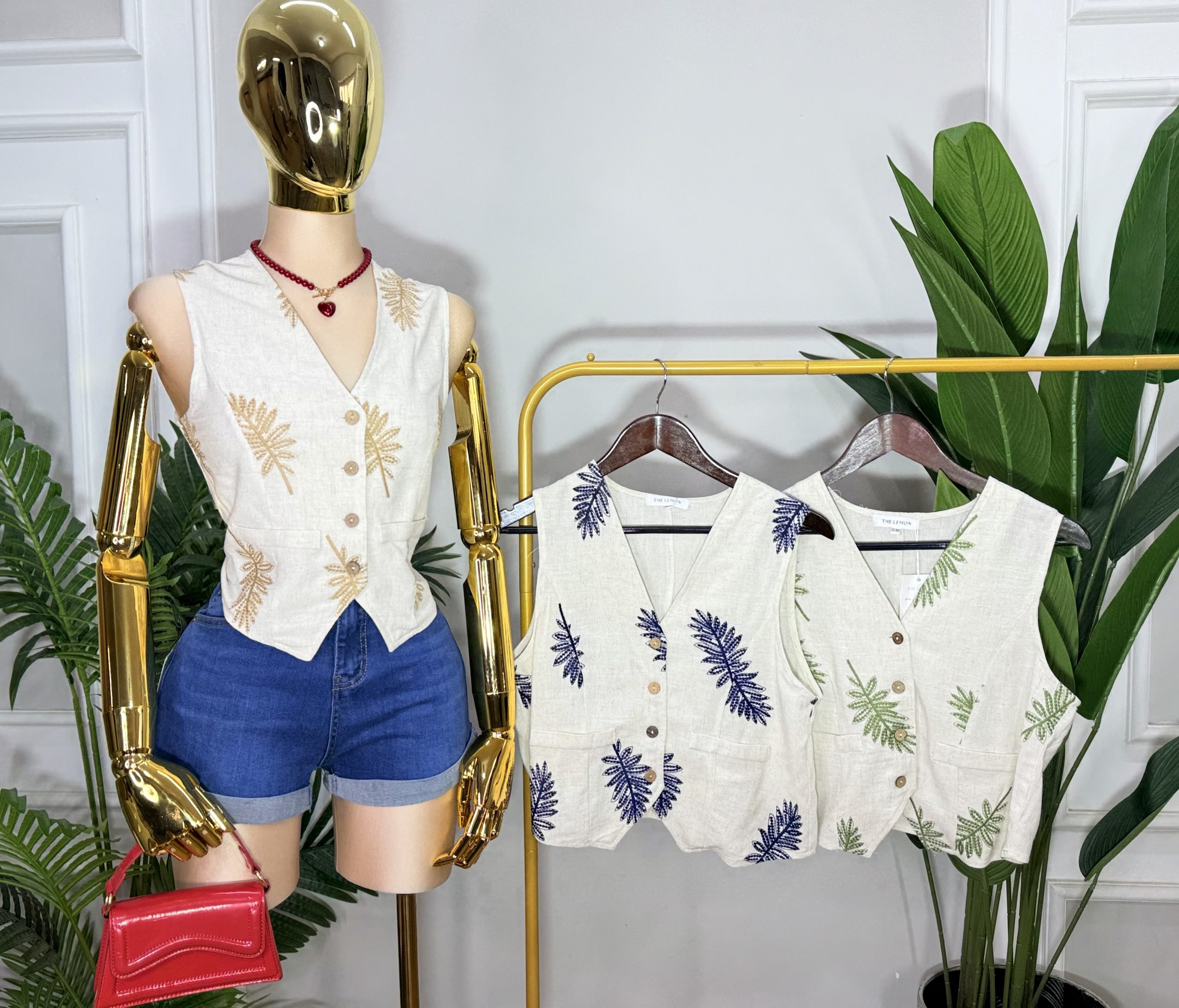 Chaleco sin mangas de corte clásico y escote en “V”. Bordado de hojas en todo el frente. Botones frontales estilo rústico. Bolsas decorativas en la parte inferior. Confeccionada en lino, fresco y ligero, ideal para clima cálido. Estilo versátil. Perfecto para looks casuales con jeans o faldas, o para outfits con estilo boho.