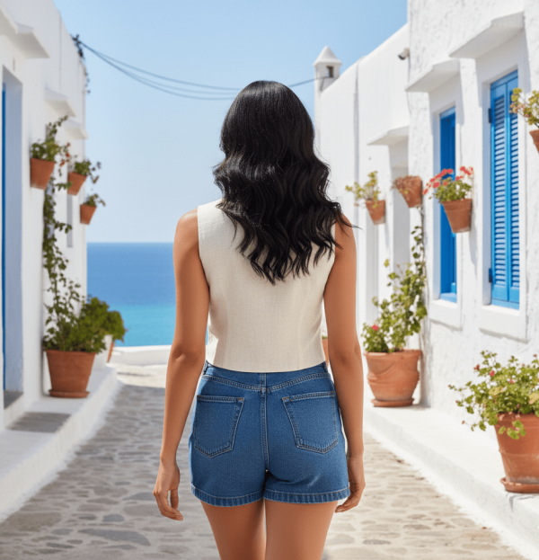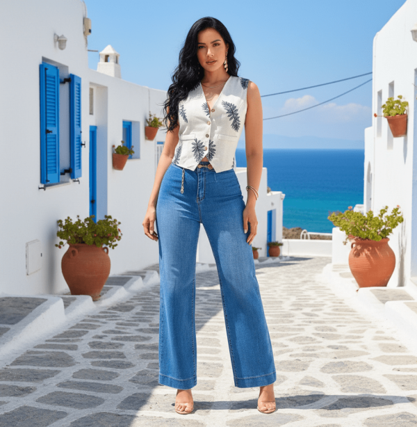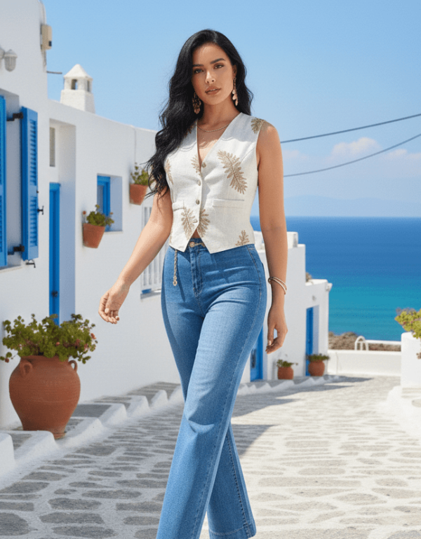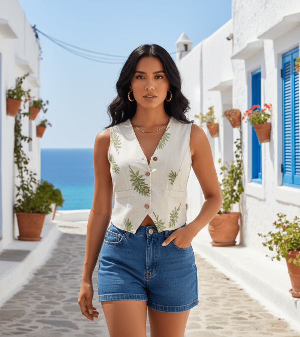 Chaleco sin mangas de corte clásico y escote en “V”. Bordado de hojas en todo el frente. Botones frontales estilo rústico. Bolsas decorativas en la parte inferior. Confeccionada en lino, fresco y ligero, ideal para clima cálido. Estilo versátil.
