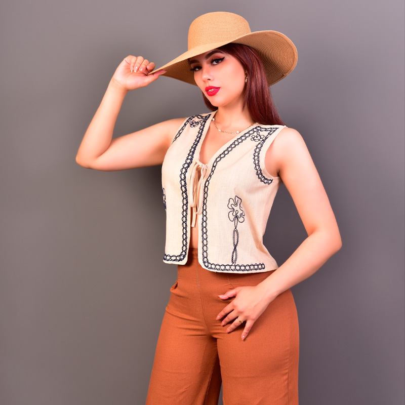 Chaleco de lino y algodón, con detalles de bordados contrastantes. Correas para cerrar al frente. 📌 Corte fiel a la talla 📦 IMPORTACIÓN Calidad: 💎💎💎💎💎