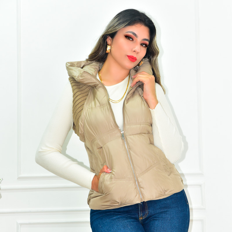 Chaleco esponjoso con capucha, acabado brillante, con forro mate. Cremallera frontal metálica. Hombros de punto canale. Bolsillos frontales.