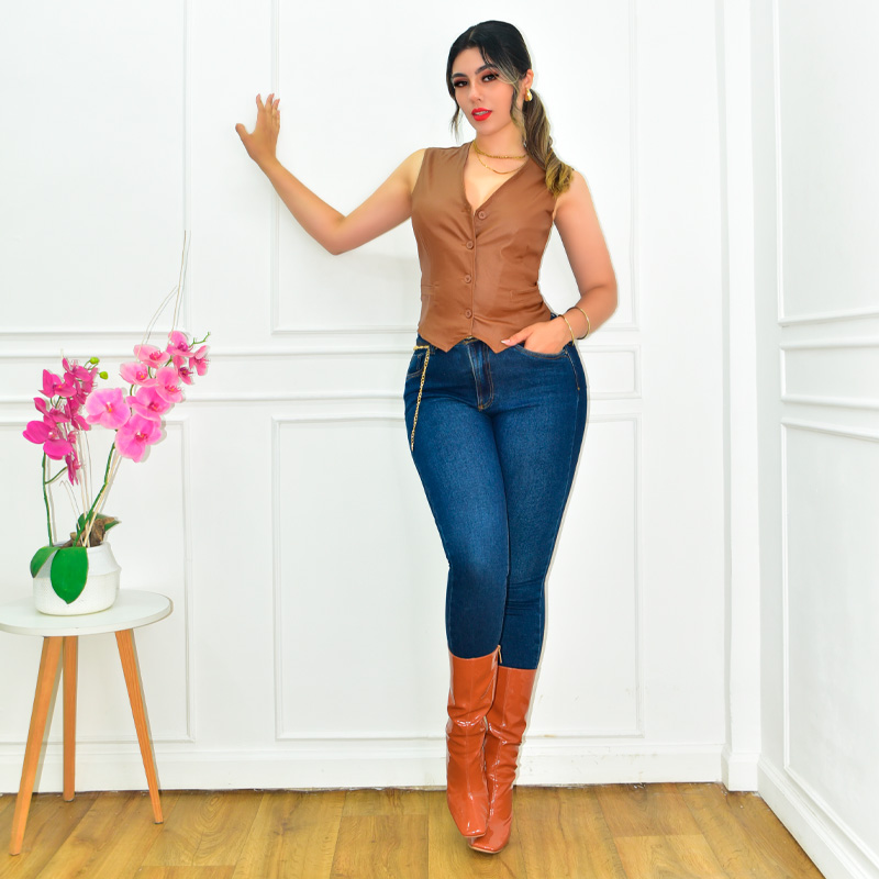 Chaleco básico de tactopiel, botones frontales en color del chaleco. Pinzas frontales. Stretch. Bolsillos de ojal.