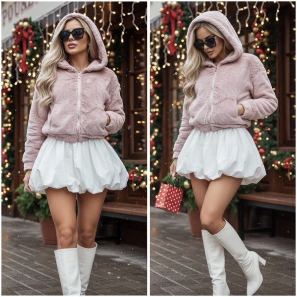 Chamarra afelpada súper suave que aporta máxima calidez. Cuenta con gorro, cierre frontal y bolsillos laterales. Diseño práctico y muy cozy. 🧸