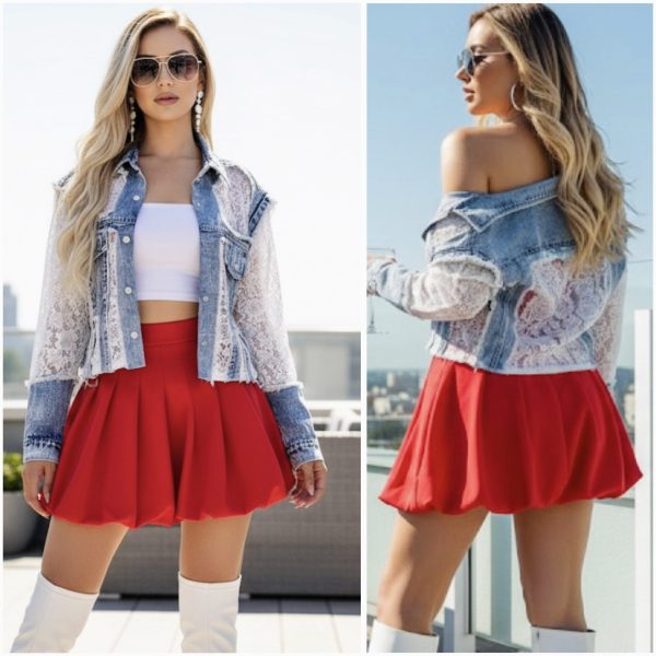 Chamarra tipo crop confeccionada en mezclilla con detalles de encaje floral en las mangas y laterales. Diseño moderno y atrevido, combinando textura denim con transparencias delicadas. Bolsillos frontales con solapa y botón, costuras desgastadas y un corte ajustado que realza la figura. Cintas ajustables en la cintura. Ideal para looks urbanos.